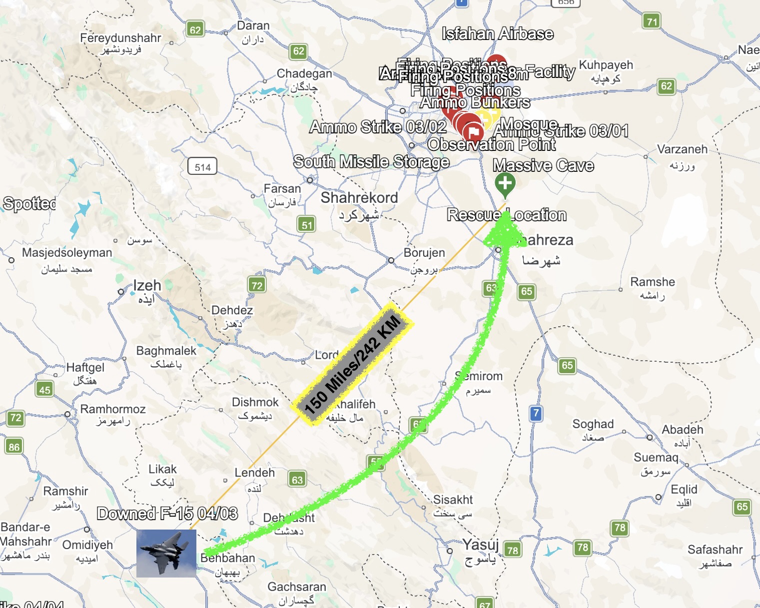 美国退伍军人Matt Tardio在社交媒体上分析称,在伊朗被击落的F-15E战斗机上的第二名机组人员为了获救,在24小时内向北移动了150英里,抵达一处地点。该地点距离美国整周都在轰炸的伊朗革命卫队导弹基地仅19英里。该基地规模极大:长20公里,拥有数百个发射阵地,就位于伊斯法罕市(人口200万)以南。