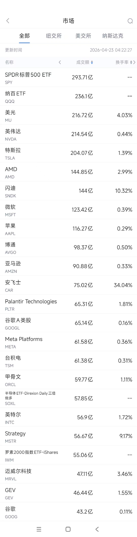 4月23日美股成交额前20:美光创历史新高,此前获高盛唱好